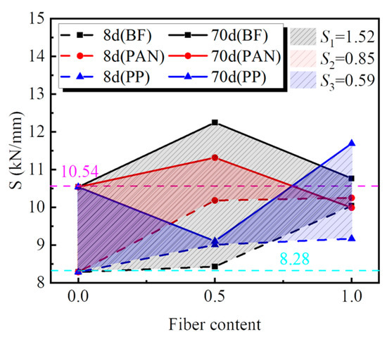 In Figure 14, the ability of various fibers to resist tensile deformation from 8 d to 70 d is comprehensively evaluated. The incorporation of fibers generally improves the stiffness of the material. From the quantitative index of area, the improvement effect of BF fiber is roughly two times that of PAN fiber and three times that of PP fiber.