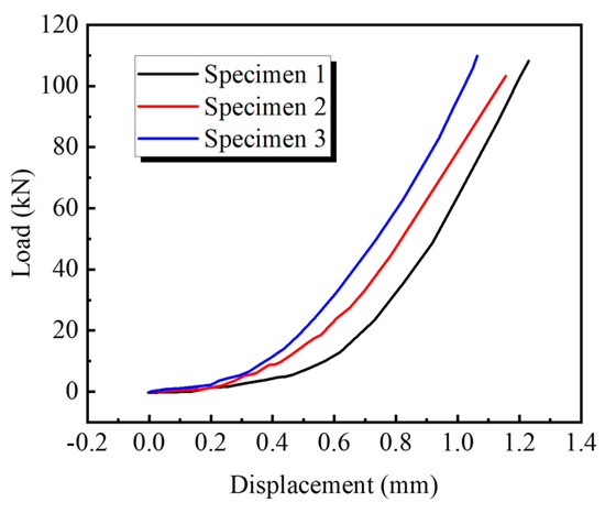 Under the action of vehicle load, the concrete in the anchorage zone of the expansion joint is not only subjected to vertical load but also to the horizontal friction between the wheel and the surface. Through the interface compression–shear test of fast-hardening PCC material and ordinary C50 concrete, the shear failure strength of the two was determined, and the finite element simulation parameters of the interface of fast-hardening PCC material were determined, providing a basis for the study of the performance of fast-hardening PCC material in the anchorage zone of the expansion joint. The interface compression–shear test is shown in Figure 15, and the compression–shear test results of fast-hardening PCC material and C50 concrete are shown in Figure 16 and Table 5.