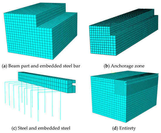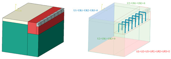 The model consists of three parts, and the size of the parts is consistent with the actual situation. In the model, red is the fast-hardening PCC material and green is C50 concrete, both of which adopt a C3D8R solid element. The grey is a discrete rigid element, as shown in Figure 17.