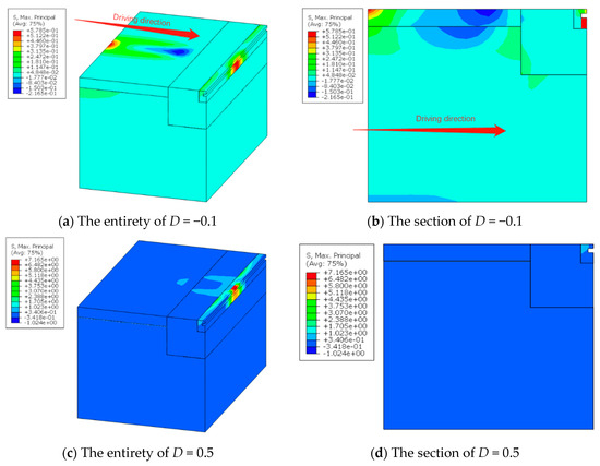 For the results of the vehicle deceleration forward model analysis, the main stress cloud (no steel) is shown in Figure 23, and the red shear head is the vehicle forward direction. It can be seen from the figure that when the wheel load is located at D = −0.1 m, stress concentrations appear at the edge of the model, in the area under the wheel and at the location of the expansion joint; when the wheel load is located at D = 0.5 m, the stress concentrations appear mainly at the location of the expansion joint, and the values are much larger than the former. This phenomenon may be due to the fact that when D = 0.5 m, the wheel acts directly on the location of the expansion joint, resulting in the horizontal load effect and the vertical load effect playing a role in the same position at the same time, so the stress value is relatively large.