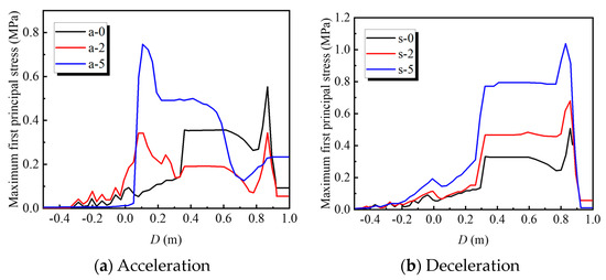 In the section of 0 < D < 1.0, when the vehicle accelerates forward, the curve σ1max-D rises rapidly at 0 < D < 0.05 and reaches a peak at D = 0.05. Then, the curve σ1max-D first flattens and then decreases, taking a pattern of 7. The second obvious peak is reached at D = 0.86, and then almost linearly decreases to the residual maximum principal tensile stress at D = 0.9 when the rear end of the wheel pressure completely passes through the anchorage zone. For the vehicle deceleration, the curve σ1max-D first rises gently, reaches a certain value and then remains unchanged, and then rises to a peak at D = 0.86.