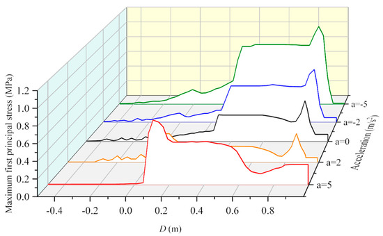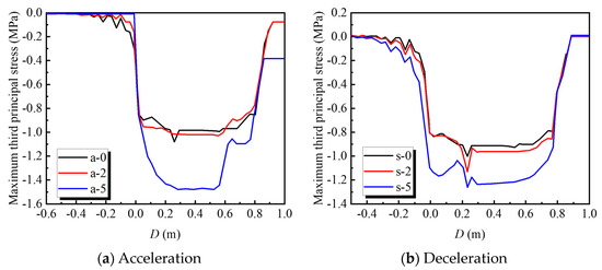 The relationship between the maximum principal compressive stress and D in the anchorage zone is shown in Figure 26. In general, the relationship curve of vehicle deceleration is similar to that of vehicle uniform speed. The greater the horizontal force, the greater the absolute value of principal compressive stress of the anchorage zone, and the farther the curve σ1max-D is from the D axis.