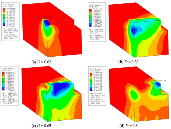 From the section of the principal compressive stress nephogram (Figure 27) of the anchorage zone (5 m/s2 acceleration), it can be seen that when D = 0.02 m, the maximum main compressive stress appears at the interface between concrete and asphalt concrete in the anchorage zone at the bottom of the wheel pressure. Meanwhile, because the elastic modulus of asphalt concrete is smaller than the elastic modulus of concrete in the anchorage zone, stress concentration occurs at the junction of the two materials. At D = 0.32 m, the front end of the wheel pressure load exceeds the anchorage zone, and the rear end of the wheel pressure has not yet entered the anchorage zone. The maximum compressive stress position moves down and appears at the junction of the asphalt concrete, anchorage zone material, and beam body. At D = 0.65 m, the rear end of the wheel pressure has entered the anchorage zone 0.05 m, and the maximum principal compressive stress appears near the rear end of the wheel pressure. At D = 0.8 m, the rear end of the wheel pressure has exceeded the boundary line of the anchorage zone and the non-anchorage zone by 0.2 m, but it has not yet gone out of the anchorage zone of the expansion joint, and the maximum principal compressive stress appears near the rear end of the wheel pressure.