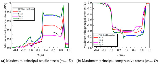 At D < 0, the wheel has not passed the boundary line, and the wheel pressure load has not been directly loaded into the anchorage zone. The curve σ1max-D fluctuates upward, and the curve σ1max-D produces an upward mutation at the position of D = 0. For the expansion joint anchorage zone of fast-hardening PCC material, resin concrete, and elastic polyurethane concrete, the peak value is not obvious, while for C50 and fiber polymer concrete, the curve σ3max-D is different, the peak value is relatively large, it seems to be enlarged, and the fluctuation of the front is relatively flat. At this stage, the curve σ3max-D also has a certain fluctuation, and the maximum principal compressive stress of the anchorage zone is not much different between different materials.
