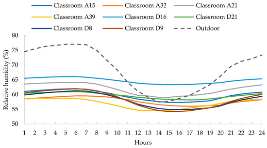 Hourly mean relative humidity of the eight sample classrooms during the summer school holiday.