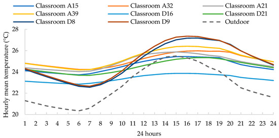 Hourly mean air temperatures of the eight classrooms during the summer school holiday without students.