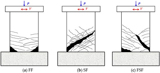 In general, an RHRC column under lateral and vertical loadings can suffer from one of the three typical failure modes, which are FF, SF, and FS [3,12,13], as illustrated in Figure 1. As presented in Yeh et al. [13], FF has high ductility, in which the column experiences lateral cracks, yielding of longitudinal reinforcing bars, spalling of cover concrete, crushing of compressive concrete, or bulking/rupturing of longitudinal reinforcements (Figure 1a), whereas SF is a brittle failure due to significant diagonal cracks without yielding the longitudinal reinforcement, as depicted in Figure 1b. SF reduces the ductility and load capacity of the column dramatically. FSF combines FF and SF, in which the yielding of the longitudinal reinforcing bar can be formed at the bottom. Even though a certain ductility can be achieved, the column is mostly failed by shear (Figure 1c). Since the column suffers brittle and sudden damage during the shear-controlled failure, the identification and prevention of this failure mechanism are crucial issues in the seismic design process. When an RHRC column has sufficient transverse reinforcement, FF may govern; otherwise, SF or FSF may govern [13]. However, the failure mechanism of the column also strongly depends on the aspect ratio and material properties [6,7]. Moreover, since there are numerous existing uncertainties along with the complexity of the damage mechanisms, it is difficult to estimate the failure modes of RHRC columns.