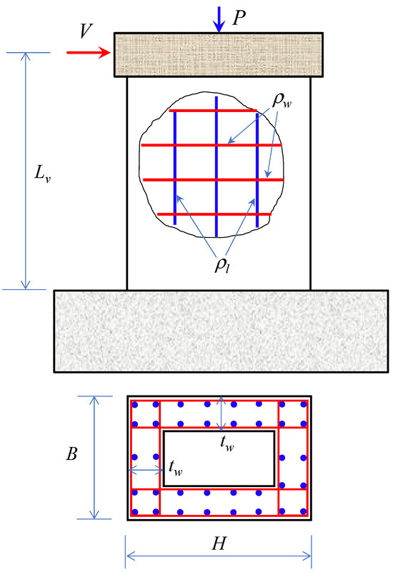 This study collects experimental test results of RHRC columns from the literature [1,2,5,12,13,29,30,43,44,45,46,47,48,49] to develop ML models. It should be noted that all experimental samples were published in scientific journals and conference proceedings from 1983 to 2022. The maximum strength values of experimental RC columns are selected as the output values of the database. Moreover, failure modes were emphasized in those experiments. Meanwhile, all eleven design parameters of hollow columns are used for input parameters of the database. Based on the previous studies [6,39,41,50,51], the factors affecting the failure modes and shear strength of RC members can be grouped as geometric dimensions, reinforcing bar details, and material properties. The structural configuration includes the column height (), the cross-section width (), the cross-section length (), and the wall thickness (). In the case of the reinforcing bar details, the longitudinal reinforcing bar ratio (), the transversal reinforcement ratio (), and the spacing of transversal reinforcements () are included. And for the level of material properties, the yield strength of the longitudinal (), the yield strength of the transversal (), and the compressive strength of concrete () are crucial. Moreover, the axial load () also affects the failure modes and shear strength of RC columns. Therefore, these parameters are collected and considered input variables in this study.