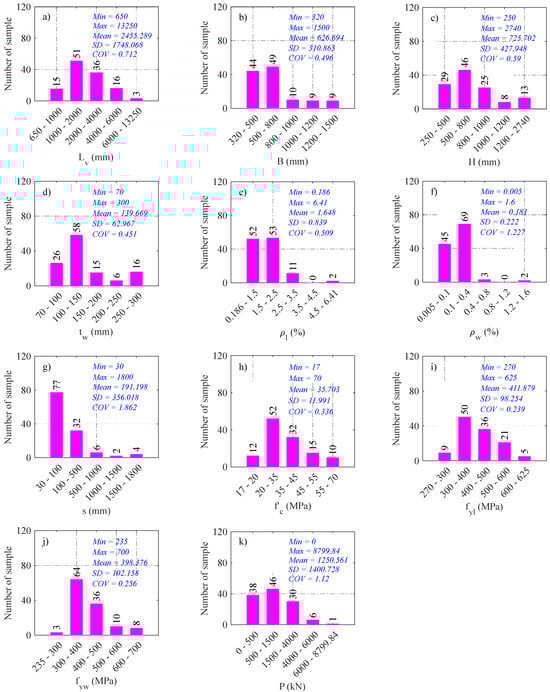 Figure 2 schematically shows the configurations and reinforcement properties of RHRC columns. The frequency histograms and statistical properties of input parameters, shear strength, and failure modes of the database are shown in Figure 3 and Figure 4. It should be noted that there are 61, 42, and 18 column samples failed with FF, FSF, and SF, respectively.