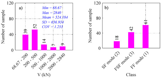 Histograms of output parameters: (a) shear strength, (b) failure modes.