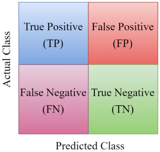 To evaluate the classification ML models’ efficiency, several metrics, such as accuracy, recall, precision, f1-score, and area under the curve (AUC) of the receiver-operating characteristic (ROC) curve, are used in this study. These metrics are calculated based on the confusion matrix, as shown in Figure 6.