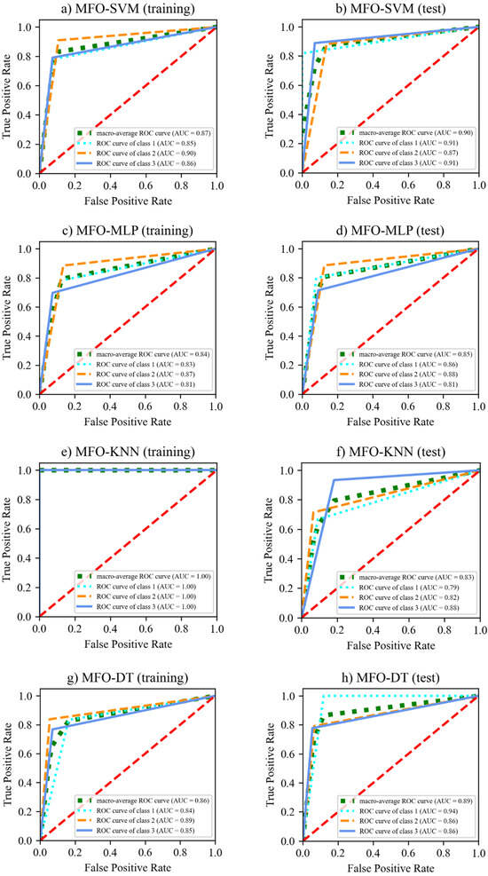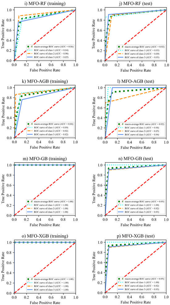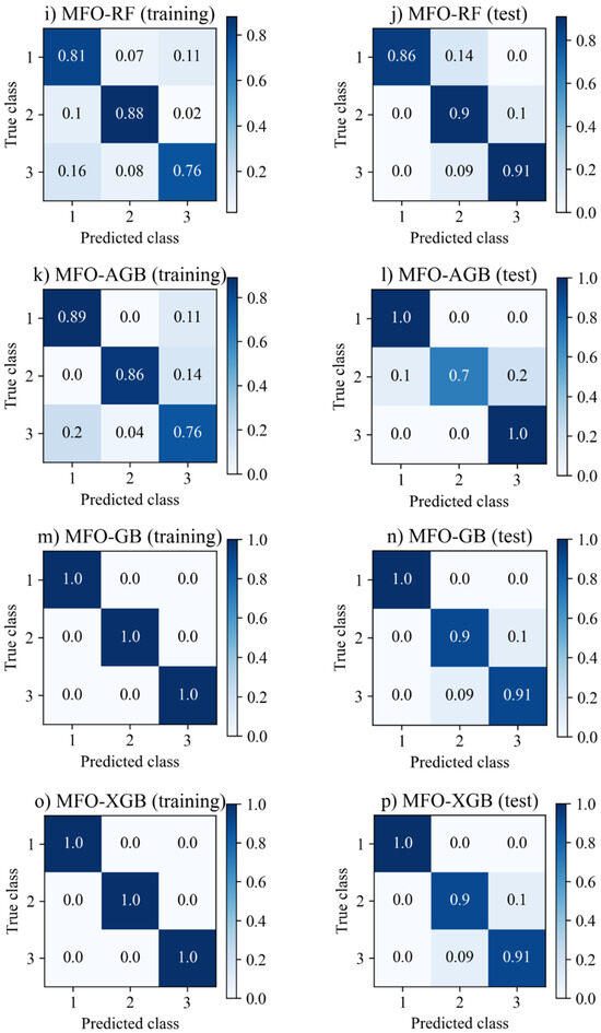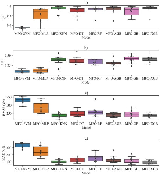 The step-by-step procedure for constructing the hybrid ML models is shown in Figure 8. Firstly, the data samples are arbitrary split into training and test sets. Models are established from the training set to choose the best values of hyperparameters; meanwhile, the test set is used to see how the models perform. In this study, eight training ratios (i.e., 0.55, 0.60, 0.65, 0.70, 0.75, 0.80, 0.85, and 0.90) and corresponding test ratios (i.e., 0.45, 0.40, 0.35, 0.30, 0.25, 0.20, 0.15, and 0.10), respectively, are used to investigate the effect of training and test data partitions. Additionally, six population sizes (50, 100,150, 200, 250, and 300) in the MFO algorithm are considered. This study utilizes a five-fold CV for the training dataset. The process is repeated five times via the MFO algorithm, and the test folds are averaged to establish a prediction model. The fitness functions are the average f1-score of five testing folds in the classification models and the average MAE of five testing folds in the regression ones. The primary hyperparameters and their ranges for the classification and regression ML models are presented in Table 1 and Table 2. Detailed descriptions of the hyperparameters were presented in the Scikit-learn package [52].