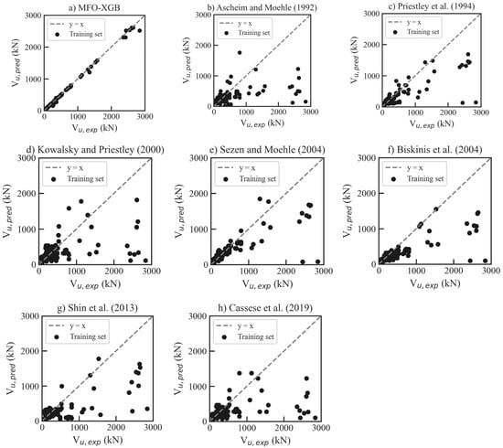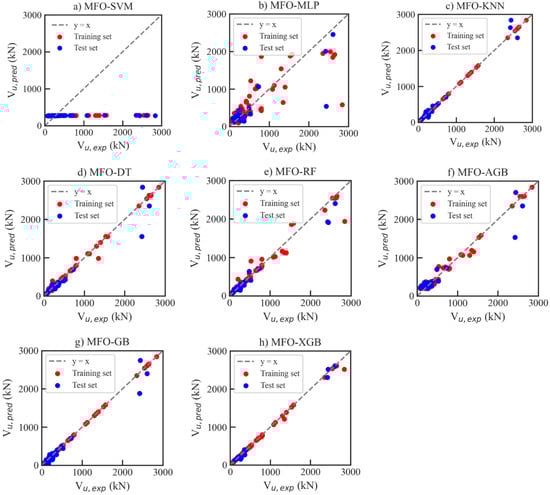 - Among the ML models, the MFO-XGB model outperforms others in both classifying the failure modes (accuracy of 92.9% for test set) and predicting the shear strength (= 0.996 for test set) of RHRC columns. In addition, the results indicate that the MFO-XGB model is more accurate than the empirical models for shear strength prediction.