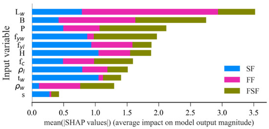 The relative importance of input variables are depicted in Figure 17 for each failure mode. The most important feature to each class is located at the top of the figure. In Figure 17, the red and blue dots indicate high and low feature values. The high SHAP value of the feature increases the likelihood of the failure mode with a slight increase in the corresponding value. Figure 17a shows that when increases, the SHAP value increases, and the model tends to show FF. Figure 17b depicts that the higher value of corresponds to a lower SHAP value, and the model tends to show SF. However, when increases, the model tends to show FSF, as shown in Figure 17c. The variations of other parameters on the failure modes can be explained similarly.