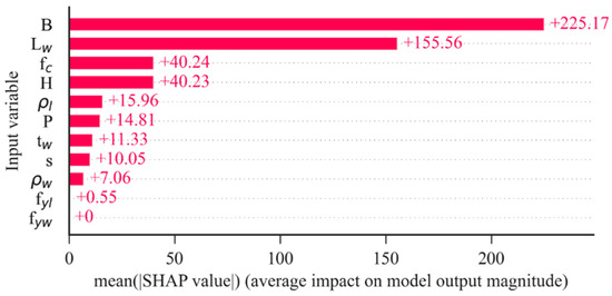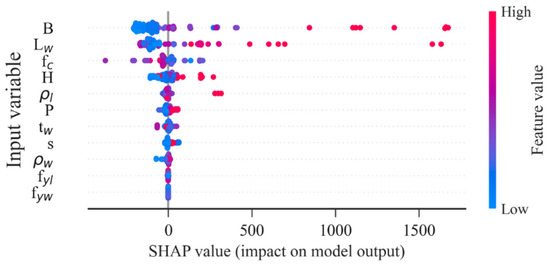 The effects of the input parameters on predicting the shear strength of RHRC columns are presented in Figure 18. A SHAP summary plot of the regression MFO-XGB model is presented in Figure 19, where each dot is an individual data point in the dataset. These figures show that the most influential feature to shear strength is , followed by , , , , , , , , , and . Moreover, Figure 19 shows that shear strength increases when , , and increase, while an increase in will lead to a decrease in shear strength.