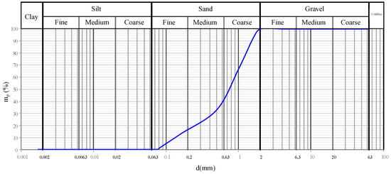 In order to analyze the relationships between water–cement–bentonite and to prevent cracking phenomena, standard sand was chosen for sample fabrication. This material is recommended and is defined in EN196-1:2016 [34]. The grain size distribution of the standard sand is presented in Table 2 and Figure 3.