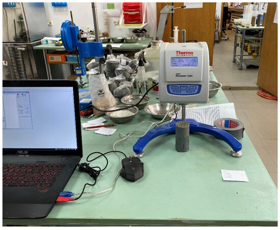 The viscosity of the material was determined immediately after it was cast in the molds. The test was carried out using a rotational viscosimeter Haake Viscotester 7 Plus (Figure 5). The device measures the resistance of the material on the different-shaped rods, based on the chosen function of the tested material. The rotation speed of the rods varied between 0.1 ÷ 100 rot/min. The test procedure for each mixture was adapted in terms of rotating plates to fit the measurement range of the device. The viscosity was chosen as the tangent in origin for the τ- curve. The results used in the analysis were chosen as a function of the stability of the measurement indicated by the device. If important variations were noticed during measurements indicating poor homogeneity, the sample was removed, remixed, and reinstalled.