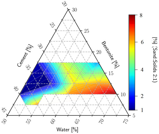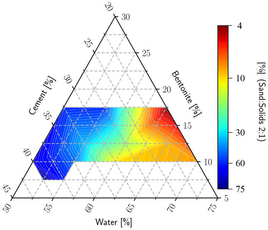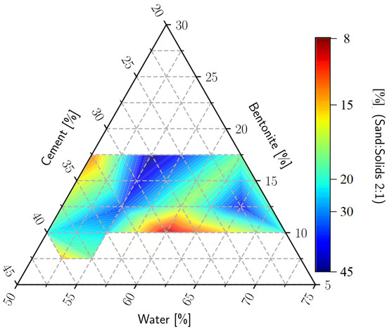 The conclusions of the first testing program indicated that a large quantity of bentonite negatively influences the compressive strength, leading to unsatisfactory crack control of the structure and decreased permeability, but it induces good hydraulic performances when it is used at a dosage of around 17%. Also, extreme values of the component tend to produce unwanted effects such as segregation, shrinkage, or low workability. [27] For the next step of the study [27], a new reduced study domain is proposed, where the results regarding the workability, permeability, and undrained cohesion are satisfying (see Figure 2).