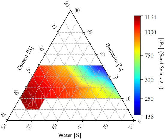 The materials used for the construction of this type of cut-off wall vary based on the function of the design requirements and the geotechnical conditions of the site. Various authors have proposed different combinations of materials in order to meet the performance criteria imposed by specific projects, including soil–bentonite mixtures [20,21], soil–cement mixtures [22,23], cement–bentonite mixtures [21], or plastic concrete [22,23,24,25]. It is also worth considering aspects of acid corrosion and heat conduction, for example [1,26].