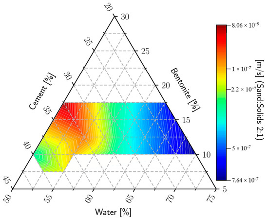 The values of permeability vary in the study domain from 7.46 × 10−7–8.06 × 10−8 m/s (Figure 11). Contrary to our expectations, the lowest permeability was determined in the samples with a larger quantity of concrete, while for the samples rich in bentonite or water, the maximum values were recorded. This fact may be attributed to the cracking of the samples due to excessive amounts of water or, on the other hand, not enough water, which is necessary for the hydration process of the bentonite.