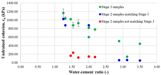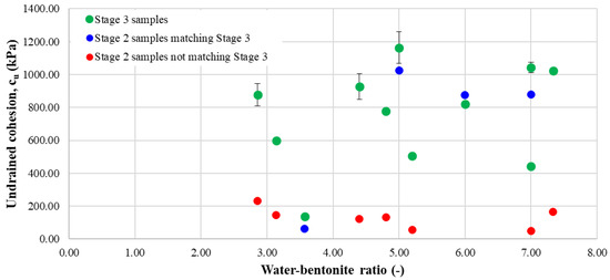 From the plots presented in Figure 13, Figure 14 and Figure 15, it can be observed that for certain mixtures, especially the ones with high undrained cohesion, the results were similar in the last two stages. This indicates that for the concrete-governed samples, the mixtures were more stable and thus the results obtained are more reliable. On the other hand, the samples that contained a larger quantity of bentonite present a wider spread of results, indicating the fact that bentonite negatively influences the curing process of the material and also induces effects that cannot be controlled nor quantified. The latter is demonstrated by the large differences between the stage 3 samples (green markers) and the substantially different stage 2 samples (red markers). The difference between the values of the undrained cohesion obtained in the third stage may be five times greater.