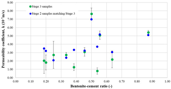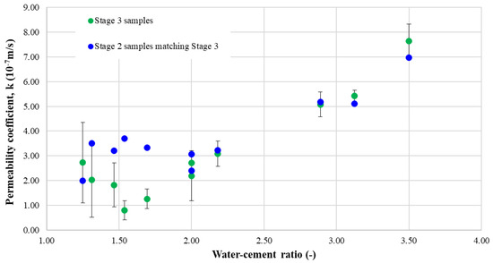 Moreover, the plots suggest that larger quantities of water used for the fabrication of samples induce higher permeability but are still in the same range and, at the same time, because of the more stable mixtures created, the cement-governed samples reach the lowest permeability. In almost every case, the stage 2 samples fit in the standard deviation computed for the results obtained in stage 3 of laboratory testing.