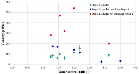 Viscosity plotted against the water–cement ratio.