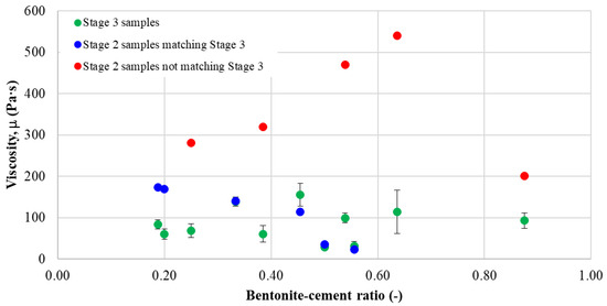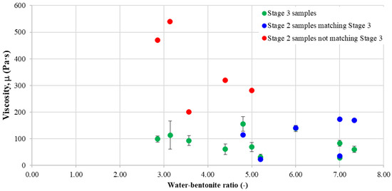 The viscosity results were plotted and show that for more than half of the mixture combinations, the results are consistent from one stage to another. Four types of samples that did not fit in the same interval as their correspondent from the third stage were determined, with their values being significantly different; these are not included in the standard deviation interval plotted around the green markers. This observation, once again, highlights the importance of having more results from the same laboratory tests in order to determine a more precise interval of variation in one parameter. The fact that the values represented by the red markers are at least twice the values obtained in the third stage of testing suggests that there might be a problem regarding the staged procedure for manufacturing the samples. One issue that might be raised is the insufficient bentonite or cement hydration during the mixing sequence.