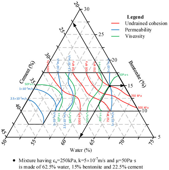 The paper provides an easy tool as a graphical representation with isocurves where the optimal water–cement–bentonite mixture can be found starting from the required design parameters (such as viscosity–workability, permeability, and undrained cohesion).