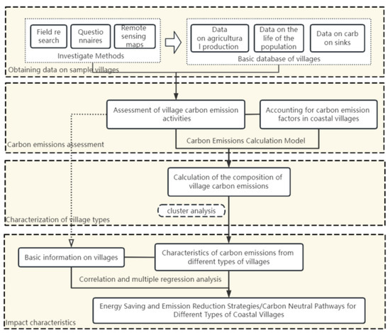 The purpose of this paper is to analyze the carbon emission characteristic composition and carbon reduction potential of coastal villages; the acquisition of carbon emission composition needs to be carried out via the design of the questionnaire based on the current existing relevant research foundation; this paper determines the questionnaire content via the expert interviews and the literature combing [31,32,33] and determines the overall research steps using the result orientation based on the carbon emission characterization method of coastal villages; the research is specifically carried out in four steps, as shown in Figure 1.