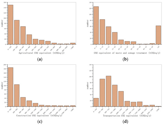 The distribution of equivalent carbon dioxide (CO2e) emissions from agricultural production, waste and sewage treatment, residential life, and transportation is shown in Figure 4. It can be seen that the sample of agricultural carbon emissions is mainly concentrated between 0 and 100, which is lower compared with residential life and transportation but higher than the carbon emissions generated by domestic waste and sewage. Residential living carbon emissions are more concentrated; annual carbon emissions are mainly 300 tons of CO2e, but there are also quantities higher than 300 tons of CO2e. This shows that the coastal areas of the countryside have better economic development, and the energy structure is relatively advanced. For waste and sewage, due to the current centralized treatment mode being quite mature, the treatment method is basically fixed for landfill and incineration, so the carbon emissions of domestic waste and sewage are mainly from the degradation of carbon emissions within the calculation boundary of the countryside, and the amount of carbon emissions in the samples is also relatively centralized, which is related to the economic conditions. If the economic conditions are better, domestic waste and sewage will be higher as well. This is related to their economic conditions, as better economic conditions tend to produce higher amounts of domestic waste and sewage [51,52]. From the histogram of emissions, transportation GHG emissions show a significant normal distribution. The GHG emissions from waste disposal are at a low value. Agriculture and residential GHG emissions also show significant differences.