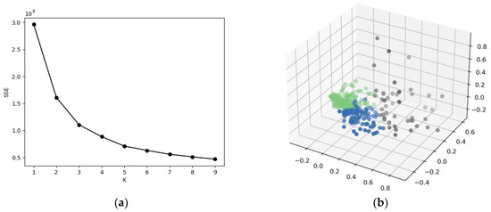 Since the number of clusters could not be determined in advance, the “elbow rule” was used to determine the optimal number of clusters by comparing the sample error squared and SSE under different numbers of clusters [40]. The inflection points where the SSE decreases significantly are selected as the optimal number of classifications. In this study, the change in the error sum of squares with the number of clusters is shown in Figure 5a, which shows that when k = 3, the error sum of squares decreases at a significant “inflection point”, so this paper divides the sample data into three categories. According to the elbow rule, the research village data are divided into three major categories after dimensionality reduction clustering, and their data distribution is shown in Figure 5b, using k-means clustering to cluster the three major parts of the data distribution in three-dimensional space to present the characteristics of aggregation, indicating that according to the elbow rule clustering data classification effect is good, and it has a clear degree of differentiation and statistical classification significance.