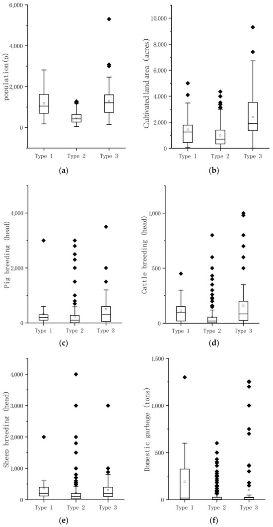 From the basic case information of the villages in the clustering center, type 2 is the general pattern of coastal villages, which belongs to the lower level in terms of population and cultivated land, and type 3 of carbon emission is mainly the high-intensity pattern of coastal villages, which is in the higher level of coastal villages in terms of population, cultivated land, animal husbandry, and all kinds of living and production modes, etc. Type 1 is relatively similar to type 2 in terms of basic information about the villages and production and life, but it belongs to the more extreme level; in terms of energy consumption, it is higher than the other two types, which is an extreme level. The distribution of the mean values of basic rural information by type is shown in Figure 6. It is clear that type 2 is at a lower level in all aspects, while type 1 is closer to type 2 in terms of population and number of farms but significantly higher than the other two types in all aspects of energy consumption, except for arable land, which is lower than the average of type 2.