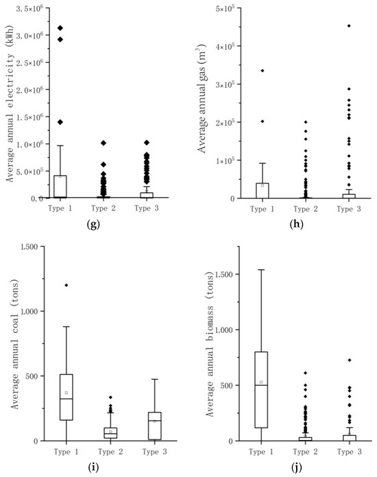 Distribution of basic rural conditions by type. (a) Distribution of population by type. (b) Distribution of cultivated land area by type. (c) Distribution of pig breeds by type. (d) Distribution of cattle breeds by type. (e) Distribution of sheep breeds by type. (f) Distribution of domestic waste by type. (g) Distribution of average annual electricity by type. (h) Distribution of average annual gas by type. (i) Distribution of average annual coal by type. (j) Distribution of average annual biomass by type.