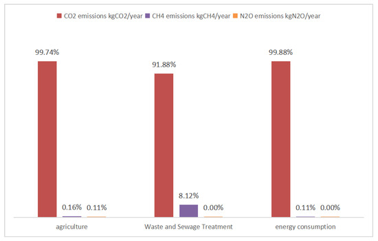 In the greenhouse gas calculation method proposed earlier, except for the influence of the number of animal breeds on the amount of nitrogen input to farmland, the influencing factors of each emission pathway do not intersect, and the structure of greenhouse gases in the same emission pathway is basically the same. On average, the main GHG emitted from agricultural production is carbon dioxide, accounting for 99.74%, which comes from the use of fertilizers, pesticides, agricultural films, and other types of agricultural materials, followed by nitrous oxide emissions caused by nitrogen input from chemical fertilizers, manure, straw, and other nitrogen; due to the small area of rice cultivation in Hebei, the smallest proportion of GHGs in the agricultural sector is methane, and it mainly comes from agricultural waste-water. Waste and sewage treatment greenhouse gases are dominated by methane, accounting for 91.88% of the total, originating from landfills and domestic sewage, followed by carbon dioxide and nitrous oxide, originating from waste incineration and domestic sewage, respectively. Energy consumption emitted 99.88% carbon dioxide. The exact percentage is shown in Figure 7.