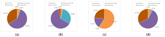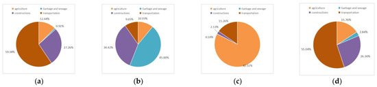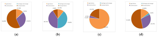 Distribution of Equivalent Carbon Dioxide (CO2-eq). Agricultural CO2 equivalent (a). CO2 equivalent of waste and sewage treatment (b). Construction CO2 equivalent (c). Transportation CO2 equivalent (d).
