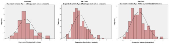 In order to test the reliability of the results of the above regression equation, it is necessary to carry out the standardized residuals test, which can be judged from the standardized residuals histogram and standardized residuals normal probability plot. From the histogram of standardized residuals (Figure 11), it can be seen that the model residuals of the total carbon emissions of the three types of villages and the basic information parameters of the villages are more in line with the normal distribution of the relationship; from the normal probability of the standardized residuals (Figure 12), it can also be seen that the samples are distributed on both sides of the diagonal of the first quadrant, which meets the validation criteria of normal distribution, indicating that the regression equation meets the requirements of residual tests; in summary, it can be decided that the regression model has a certain degree of reliability. The test analysis can determine whether the results of the regression model have a certain degree of reliability.
