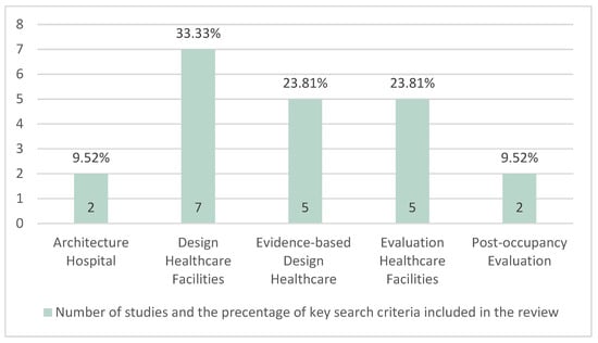 For each database, we used specific keywords relevant to our research focus. In ScienceDirect, we searched for five sets of keywords: “Architecture Hospital”, “Design Healthcare Facilities”, “Evidence-based Design Healthcare”, “Evaluation Healthcare Facilities”, and “Post-occupancy Evaluation”. These searches yielded a total of 168,467 results. We initially selected 45 articles based on their relevance to our research. After a thorough review and the removal of duplicates, we finalized a selection of 21 unique and pertinent articles.