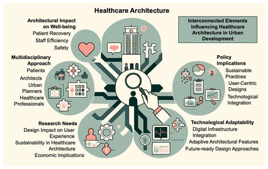 The synthesis of our findings highlights the profound interplay between healthcare architecture and the broader objectives of building design and urban development, which is at a critical juncture, facing multilayered challenges that stem from evolving healthcare needs, technological advancements, and a growing emphasis on sustainability and user experience. A visual representation of the interconnected elements influencing healthcare architecture in urban development is presented in Figure 3. The central part emphasizes the core focus on healthcare architecture, while the radiating branches highlight the multifaceted implications discussed in the study. Traditional architectural approaches often need to be more holistically addressing these contemporary demands, by considering users’ emotional and psychological well-being and the environmental sustainability of healthcare facilities. This gap emphasizes the need for a new, integrative framework to navigate modern healthcare architecture’s complexities.