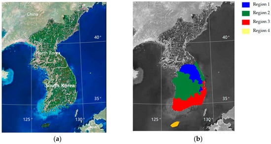 Geographical location and zone categorization of South Korea. (a) Geographical location [41], (b) Regional division according to the building energy code.