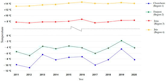 To receive a new building permit in Korea, the U-values of the building envelope components must be lower than the standard U-values dictated by the energy-saving design standards for buildings (hereafter, the building energy code) [12]. This standard has been strengthened in a step-by-step manner since 2009 and was revised in 2018. Figure 2a shows the relevant geographical information, such as South Korea’s latitude, longitude, and neighboring countries. Figure 2b illustrates the four South Korean zones defined by the building energy code, from Region 1, the coldest, to Region 4 (an island), located in the southernmost region. Figure 3 shows the minimum temperature time series for representative cities in the four regions from 2011 to 2020.