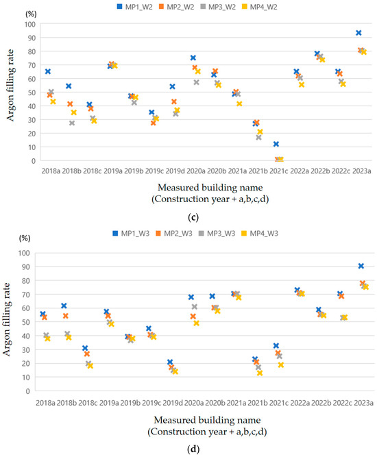 - The position of the spacer affects the argon gas filling rate; therefore, the gas filling rate is measured at four points located 10 cm away from the edge of each window frame. Furthermore, the average value is calculated. Figure 5 illustrates the listed measurement data from four locations (windows 1, 2, and 3) according to the year of completion. The upper left, upper right, lower right, and lower left points are shown in the order of MP1, MP2, MP3, and MP4. The argon gas filling rate is maintained at a higher value at the top of the window than at the bottom.