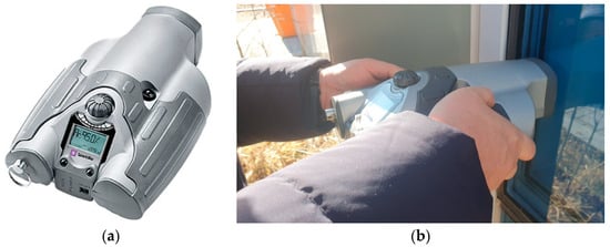 The target scope of this research includes windows installed in new buildings located in Region 2 that were completed after 2018. The filling rates of windows with argon gas were measured. A Sparklike HandheldTM device 3.0 (Sparklike, Helsinki, Finland), which operates based on spectroscopy, was used for the measurements. This device assesses gas concentrations by measuring the light emissions induced in the spatial layer of gas-filled double-glazed windows through a high-pressure spark [42]. Table 2 and Figure 4 summarize the technical specifications of the Sparklike Handheld™ device, as provided by the manufacturer. Windows composed of glass with a thickness of less than 6 mm and a cavity of less than 20 mm can be measured at temperatures between 0 and 35 °C. According to the data, the measurement error was within 1% when the argon gas concentration exceeded 90%; however, it decreased to ~3.7% at the 50% level.