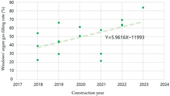 The average filling rates of the windows installed in buildings completed from 2018 to 2023 were analyzed to be 49.9%; the standard deviation was 19.2–23.6% and the filling rate for each window showed a large difference, from a maximum of 95.4% to a minimum of 0.6%. The more recent the construction year, the higher the argon gas filling rate; however, this is not an absolute trend, and it can be attributed to the argon gas filling rate being influenced by the appropriate manufacturing process and initial quality, as indicated in previous studies. As reported in a previous study [15], the thermal performance of gas-filled windows deteriorates when the argon gas filling rate falls below 80%. In this study, the argon gas filling rate of all investigated windows was confirmed to be less than 80%, except in the case of a building completed in 2023. This indicates that argon gas leakage from the windows is a serious problem.