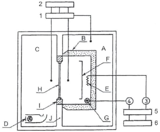 KS F 2278 test rig diagram. Letters A–J indicate the warm chamber, hot box, cold chamber, cold air discharge, heater, baffle plate, air circulation fan, test specimen, test specimen frame, and partition wall, respectively. Numbers 1–6 indicate the standard calibrator, temperature-measuring instrument, power meter for the heater, power meter for the air-circulation fan, power controller, and power stabilizer, respectively.