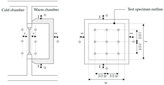 The thermal resistance of the surrounding wall of the hot box is approximately 2.6–4.3 m2∙K/W. A heating device and airflow-stirring device are installed inside the hot box, and the inside of the warm chamber is set to (20 ± 1) °C. The air temperature in the cold chamber is set to (0 ± 1) °C at the temperature measurement locations shown in Figure 9, to maintain a steady state. The temperature measurement locations for calculating the thermal resistance consist of nine points, including measuring the air temperature of the warm chamber at five points, the air temperature of the cold chamber, and the air temperature of the hot box using a thermocouple. The temperature and heat-quantity measurements were conducted three times at 30-minute intervals after reaching normalization. The heat transmission resistance was calculated using this temperature difference and the heat value that passed through the test specimen.