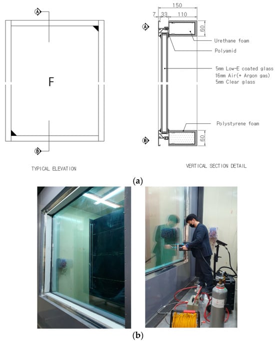 A thermal transmittance test performed according to the KS F 2278 window insulation test requirements was conducted at a testing laboratory located in Region G, to quantitatively determine the degree of change in the insulation performance of multilayer insulated glass windows according to the argon gas filling rate. Based on the high-efficiency energy equipment certification window set data provided by the Korea Energy Agency [43], a 26-millimeter double-layer glass that is commonly applied in the field was used as the target.