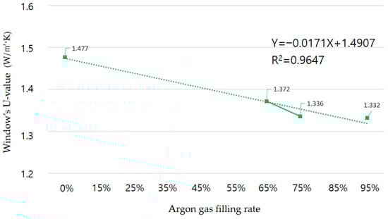- The simulation results for each argon gas filling rate for the double-glazed window were calculated, ranging from 1.171 W/m2·K for an argon gas filling rate of 95% to 1.436 W/m2·K for an argon gas filling rate of 0%. For the 1.436-W/m2·K simulation result, the thermal transmittance rate increased by 0.260 for a 10% argon gas leakage rate. The thermal performance deteriorated by up to 22.6% compared to that for the 95% scenario, which is dependent on the argon gas filling rate from 95% to 0%. This can be attributed to the frame, which is not affected by the argon gas leakage rate.
