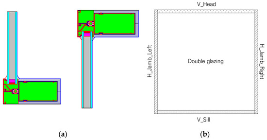 Thermal analysis model image via THERM 7.8: (a) jamb, head, and sill; (b) window structure.