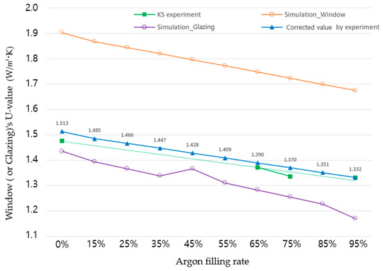 Figure 13 shows the simulation results of the double-glazed window and the glass window (the window with the frame removed), along with the KS F 2278 test results discussed in the previous section. Compared to the simulation results for the glass alone, those of the double-glazed windows showed a decrease in the insulation performance of 32.6–43.1%, with an average of 36.3%. The better the insulation performance, the greater the deterioration of insulation performance. This detailed simulation showed a value that was approximately 20.5–22.4% higher than the test result; however, when corrected based on an argon gas filling rate of 95%, as shown in Figure 12, it showed an error range of 1.3–2.5%, which is the error range established after correction. These values were found to be reliable. Table 6 lists the increase in thermal transmittance as a percentage, based on the thermal transmittance when the argon gas filling ratio is 95%.